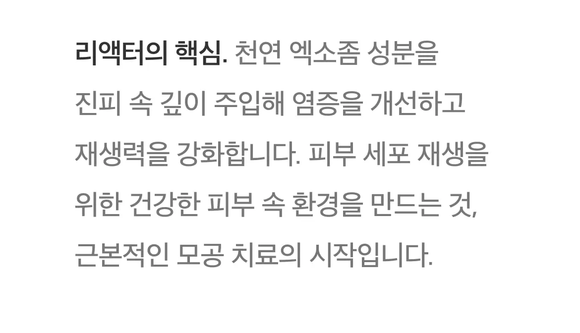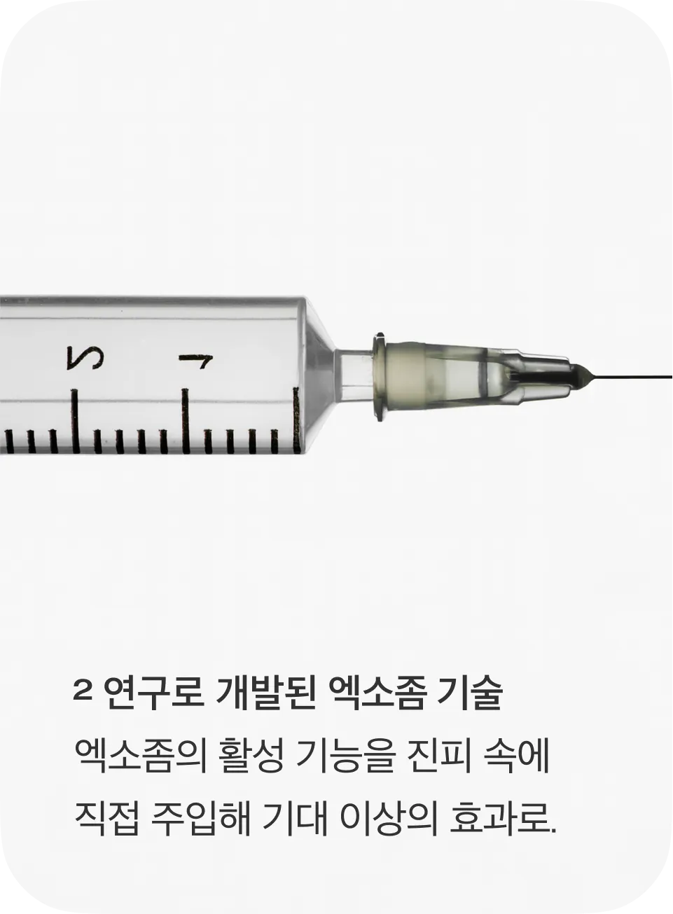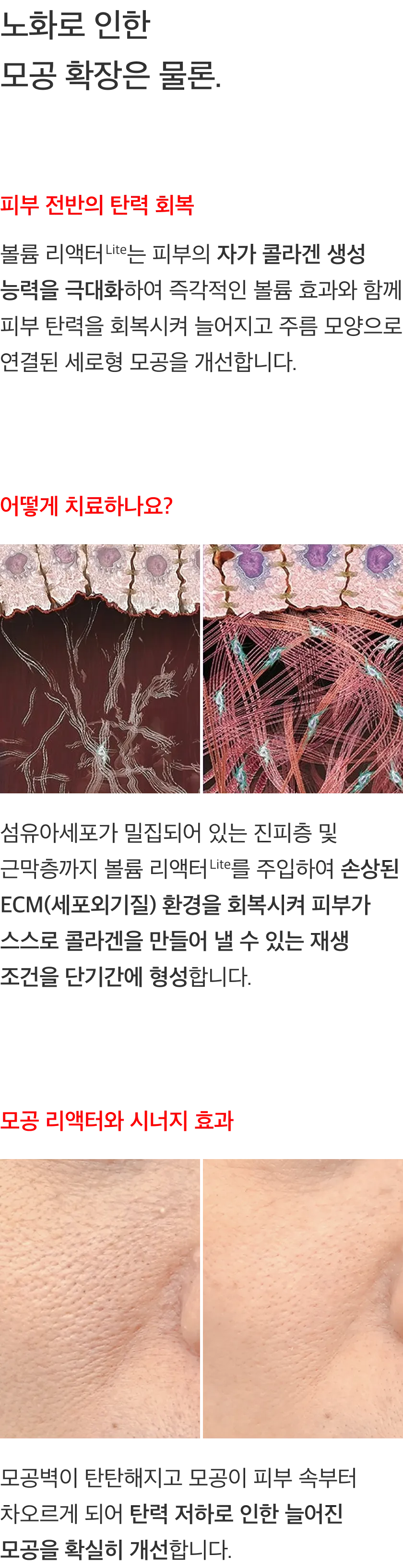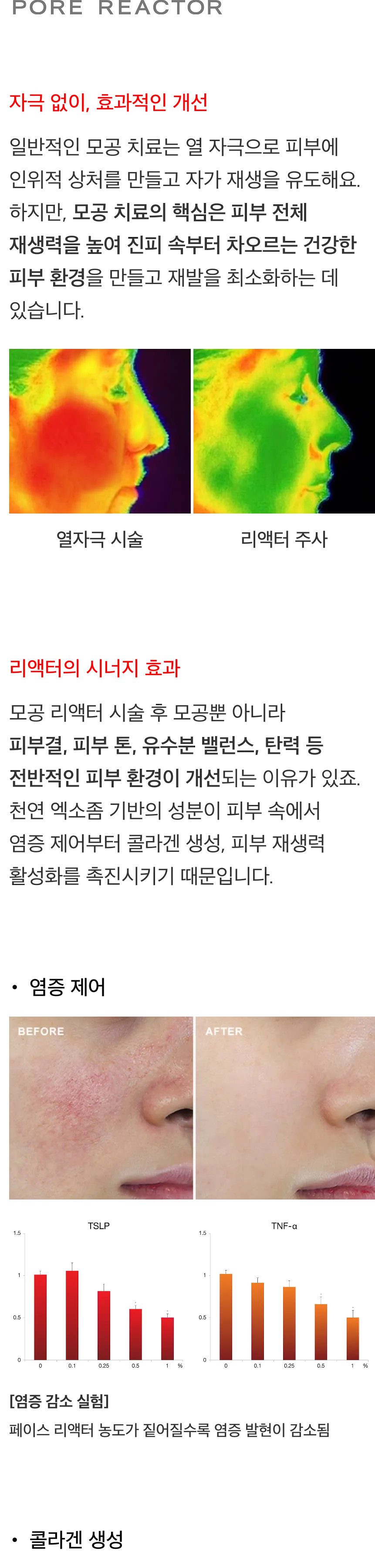 페이스 리액터의 천연 엑소좀을 고농도로 응축한 성분을 섬유아세포가 밀집되어 있는 피부 속까지 주입하여 피부 자가 콜라겐 합성 능력을 극대화하는 시술입니다. 손상된 피부 ECM(세포외기질) 환경을 회복시켜 피부 자가 재생 환경을 조성해 단기간의 볼륨 효과와 피부 탄력을 강화합니다. 노화로 인해 저하된 탄력 개선 및 늘어지고 주름 모양으로 연결된 세로형 모공 개선에 특히 효과적입니다.