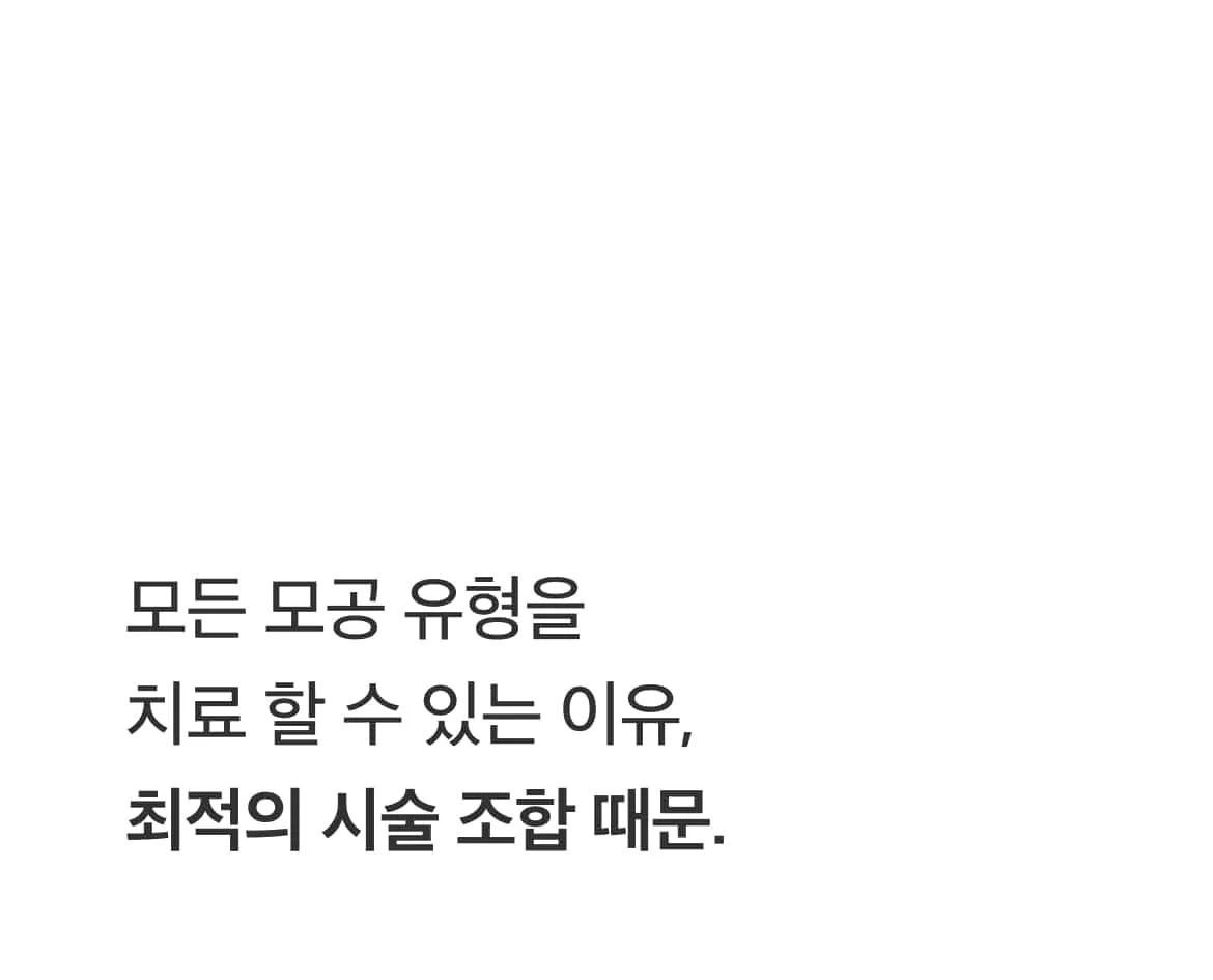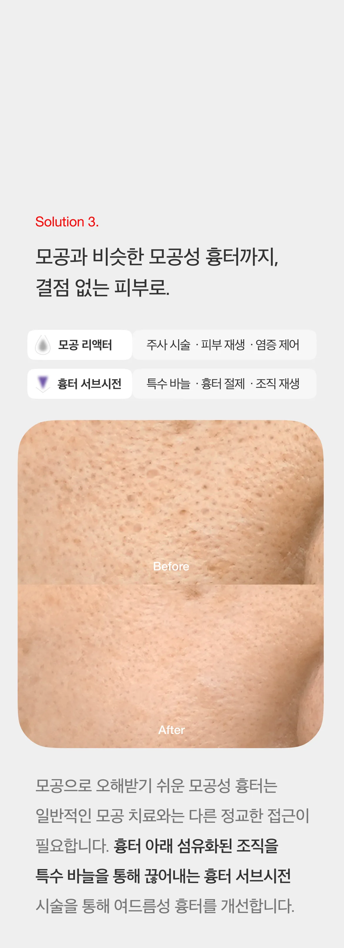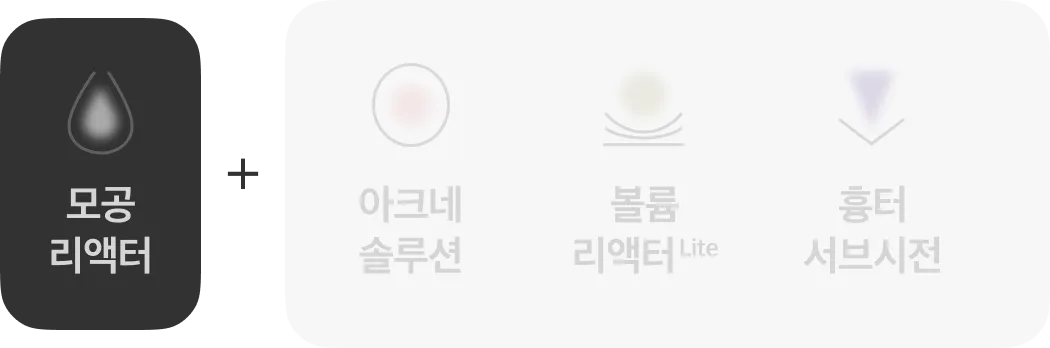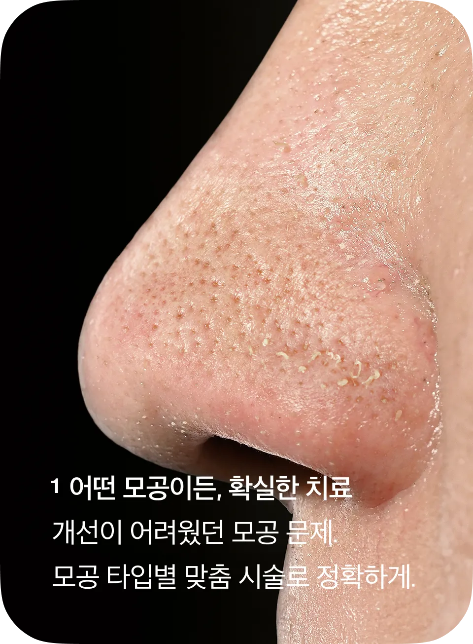 모공 확장과 형태는 다양합니다. 그래서 일반적인 모공 치료 방식으로는 제대로된 치료가 어렵습니다. 모공 리액터의 자가 콜라겐 합성 능력 회복으로 피부를 건강한 상태로 조성함과 동시에 각 유형별(여드름, 탄력 저하형, 흉터) 최적의 시술 조합을 더해 모공을 확실하게 치료합니다.