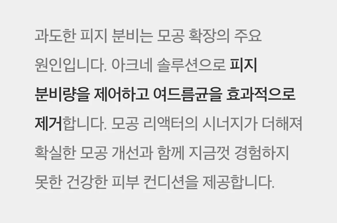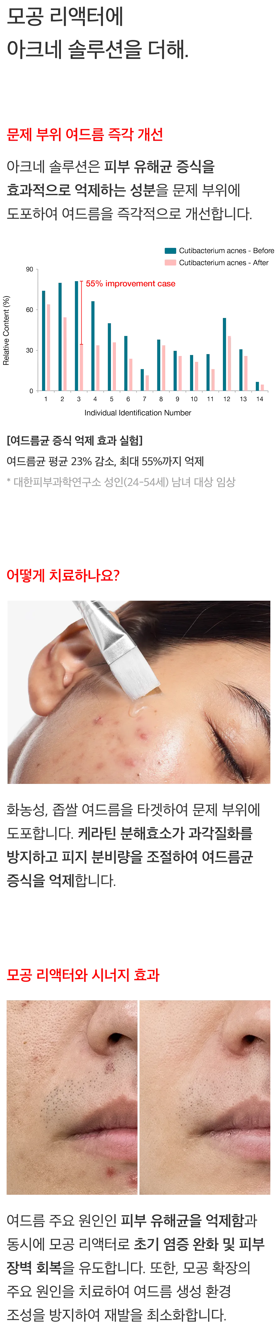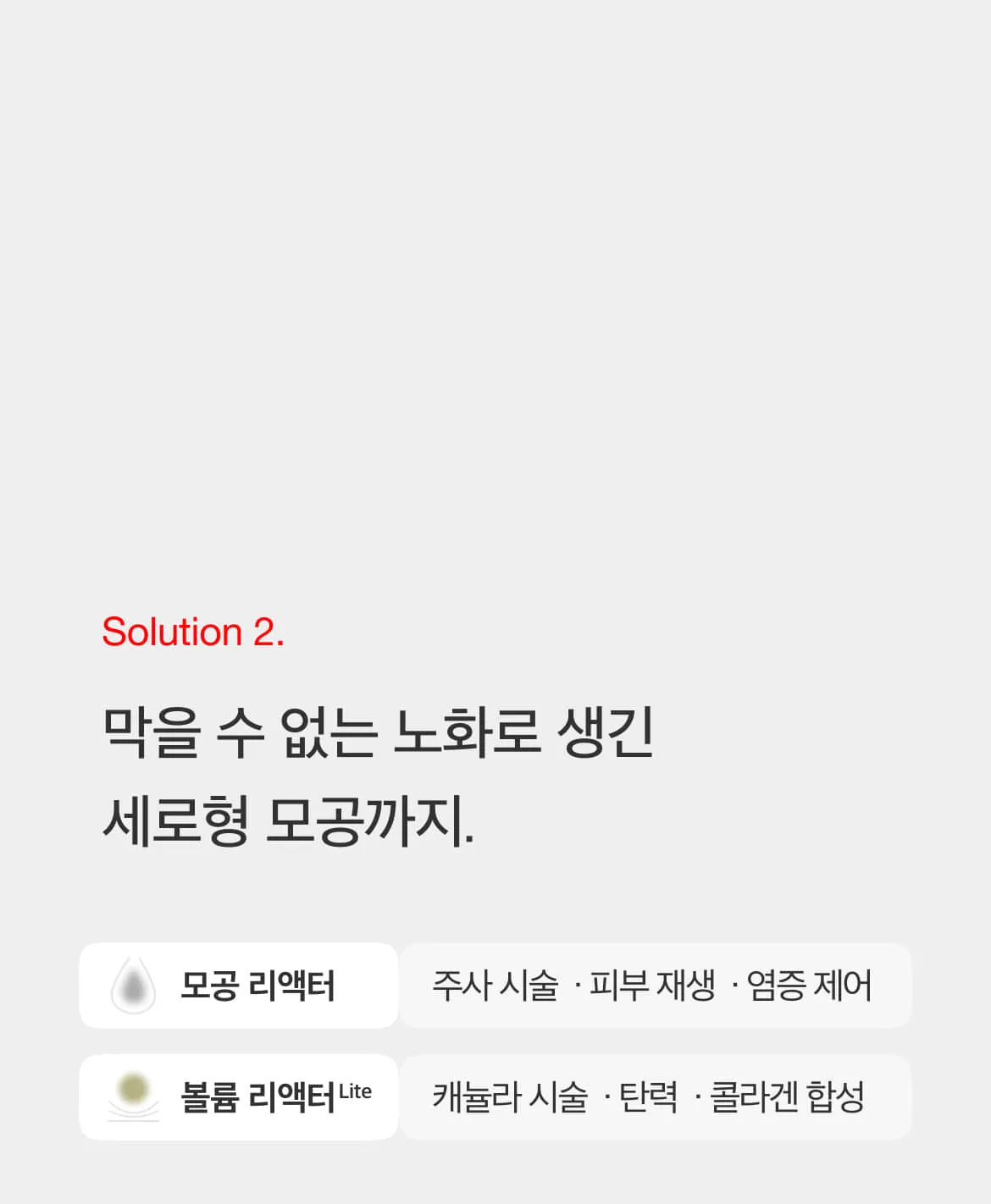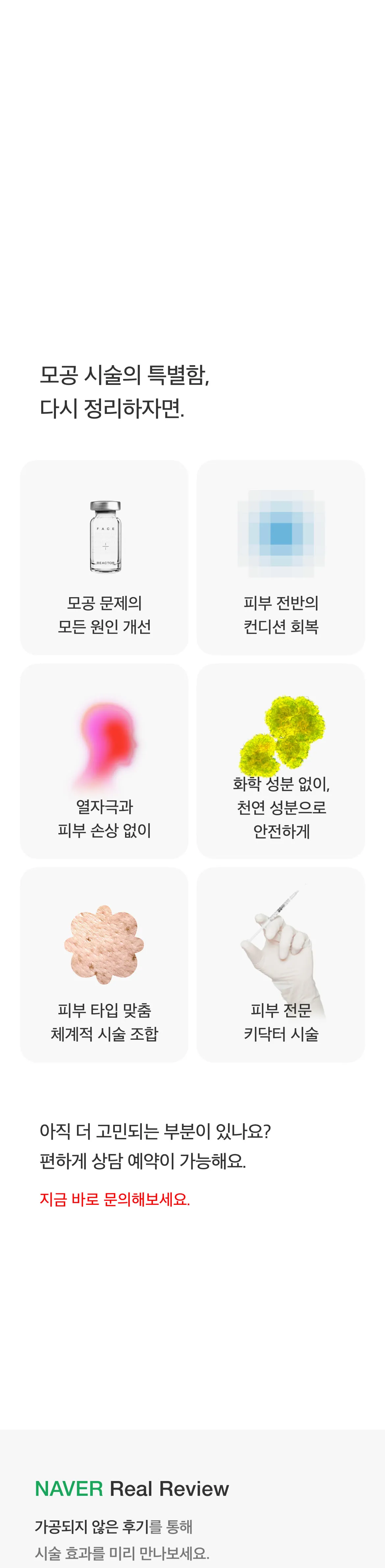 모공 확장과 형태는 다양합니다. 그래서 일반적인 모공 치료 방식으로는 제대로된 치료가 어렵습니다. 모공 리액터의 자가 콜라겐 합성 능력 회복으로 피부를 건강한 상태로 조성함과 동시에 각 유형별(여드름, 탄력 저하형, 흉터) 최적의 시술 조합을 더해 모공을 확실하게 치료합니다.