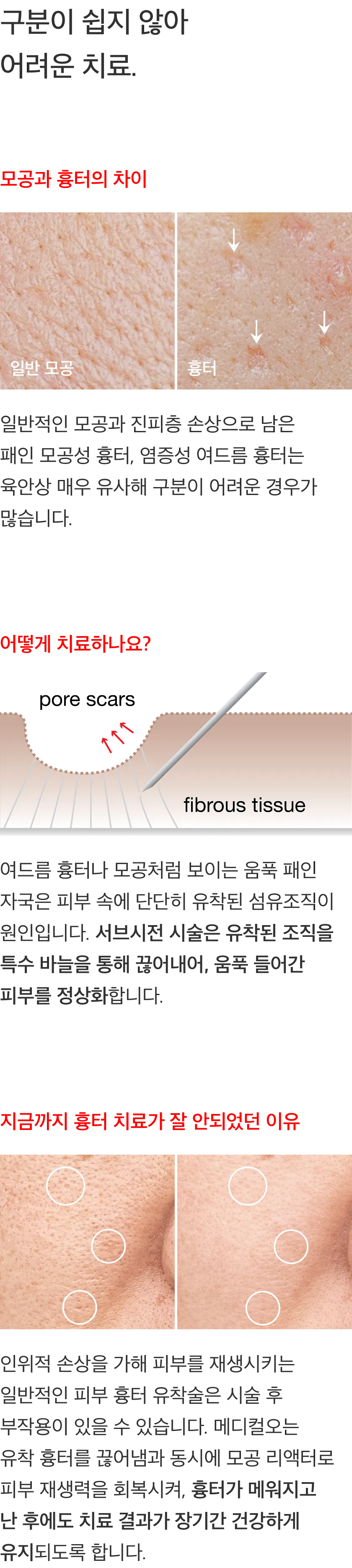 일반적인 피부 흉터 유착술만으로는 부작용과 재발 없는 확실한 흉터 치료가 어렵습니다. 메디컬오는 유착 흉터를 끊어냄과 동시에 모공 리액터로 피부 재생력을 회복시키는 접근 방식으로 흉터가 메워지고 난 후에도 치료 결과가 장기간 건강하게 유지됩니다.