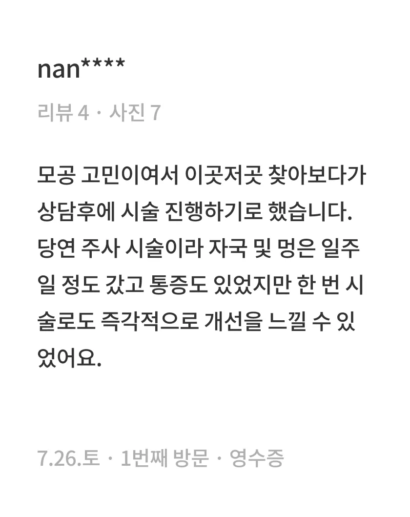 • 시술 부위에 멍이 생길 수 있습니다. 멍이 생길 경우, 2~3일 동안은 냉찜질, 이후는 온찜질 해주세요.