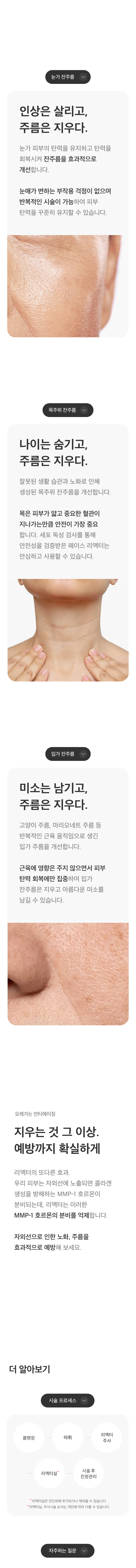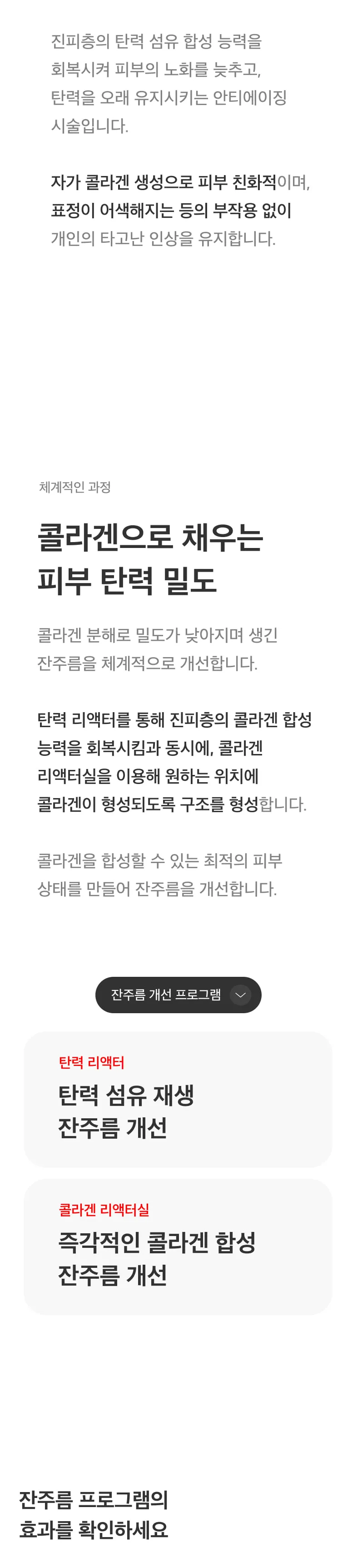 부위나 상태에 따라 탄력리액터와 콜라겐 리액터실을 따로 사용할 수도 있지만 두 가지를 함께 사용했을 때 더 큰 개선 효과를 느끼실 수 있습니다.
